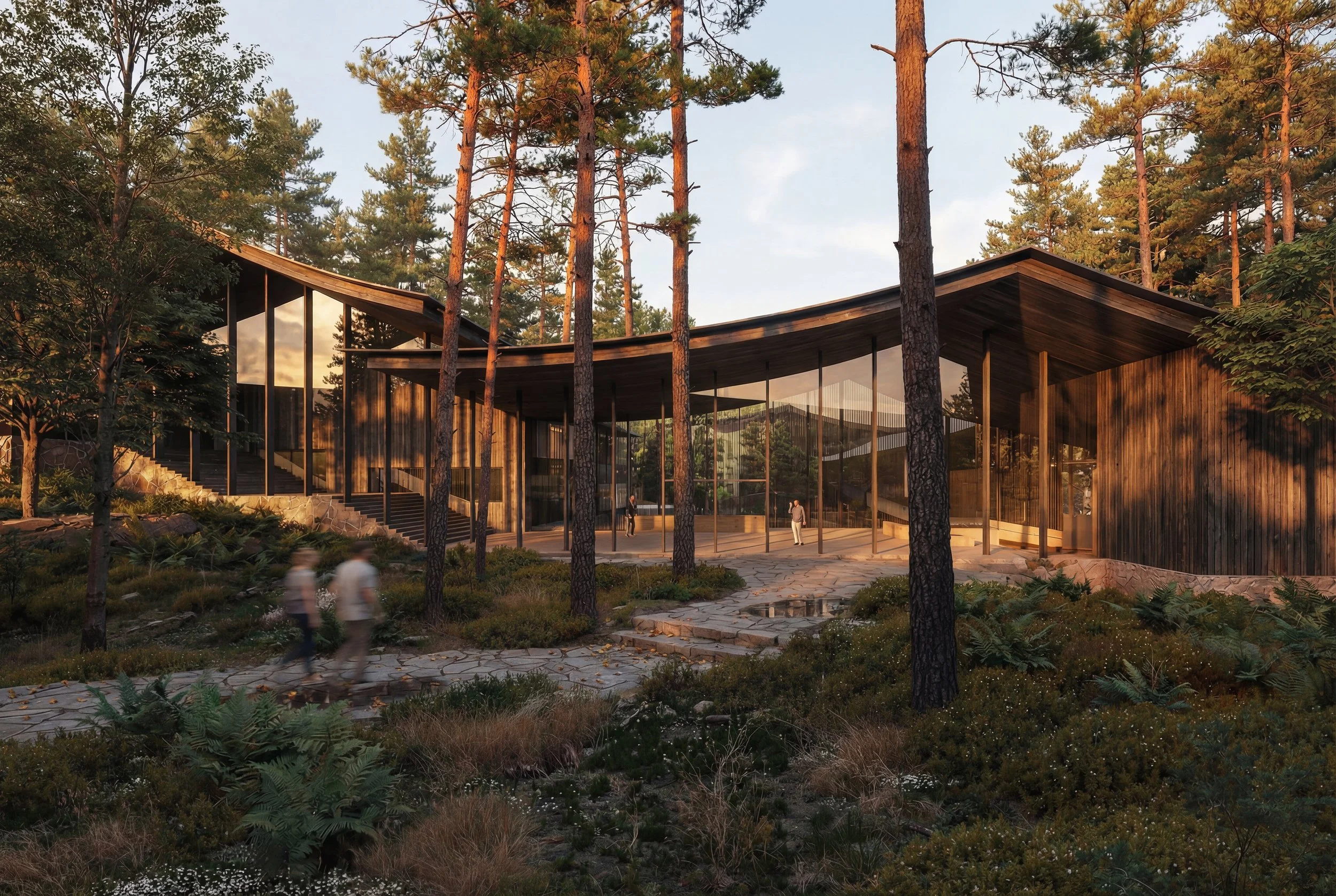 An architectural marvel beneath a lush green roof. The undulating roofline mimics the contours of the earth, while fluid organic forms evoke protection and intimacy—a tranquil oasis where nature and architecture merge.